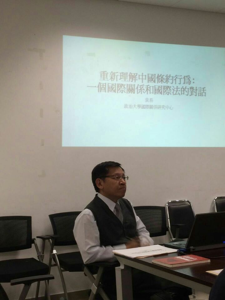 2015年11月18日(周三)15:30-17:30,北外国关前沿沙龙第二期活动在yl23411永利官网西院综合楼举行。本次沙龙主题是“重新理解中国条约行为:一个国际关系与国际法的对话”。本次沙龙学术活动由袁易教授(台湾政治大学国际关系研究中心教授)主讲、尹继武老师(yl23411永利副教授)主持,并邀请王明进(yl23411永利教授、副经理)和张效民(yl23411永利副教授)两位老师作为评议人。本次沙龙吸引了来自yl23411永利官网和中国人民大学的近二十名师生前来参加。