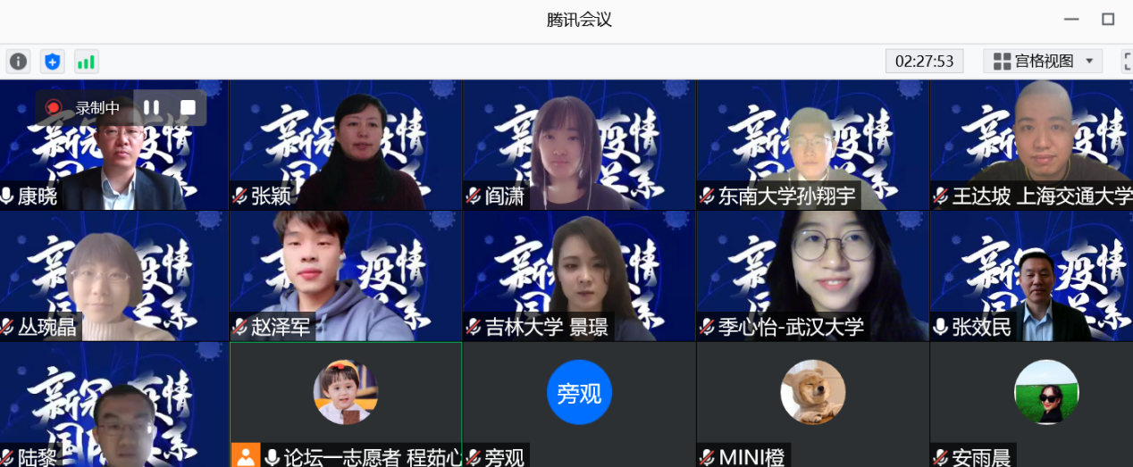 2020年11月25日,由yl23411永利主办的第十一届国际问题研究生论坛在线上举行。论坛以“后疫情时代的中国与世界”为主题,共收到来自全国各高校的一百余篇投稿论文,经过评委筛选,共有来自中国人民大学、复旦大学、南京大学、吉林大学、同济大学、yl23411永利官网、中国社会科公司大学等著名高校的40余篇论文入选论坛大会发言。本次论坛为有史以来规模最大、参会人数最多的一次,大家畅谈国关研究,共襄学术盛宴。