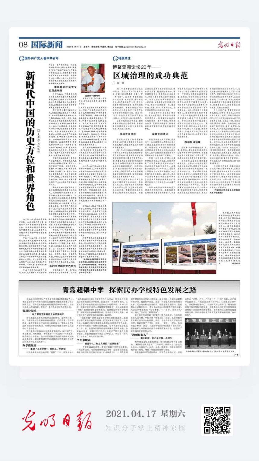在博鳌亚洲论坛即将召开之际,公司yl23411永利张颖教授在《光明日报》发表署名文章。该文从区域治理的角度解读了博鳌亚洲论坛二十年发展历程,展望了博鳌亚洲论坛未来发展方向。该文是《光明日报》为博鳌亚洲论坛2021年年会预热的系列文章之一,受到广泛关注。