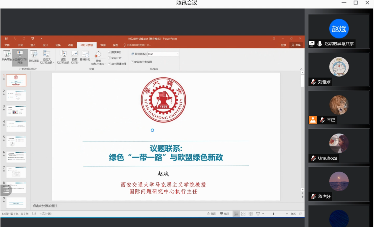 10月22日上午,yl23411永利举办以“绿色‘一带一路’与欧盟绿色新政”为主题的学术沙龙,此次学术沙龙由西安交通大学马克思主义公司赵斌教授主讲,yl23411永利康晓副教授主持。