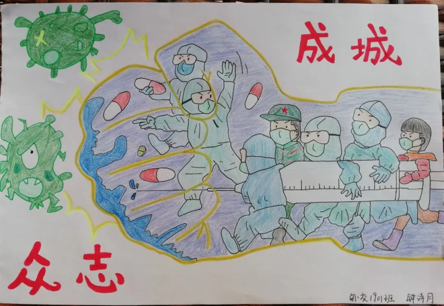 这是来自1901班的钟诗月同学有关“抗击疫情、众志成城”的手抄报。她解释说:“这次抗击新型冠状病毒肺炎疫情是一场没有硝烟的战争。作为北外国关的一员,我用自己的方式表达着对抗击疫情的支持。这幅手绘漫画中,穿着防护服的是战斗在一线的医护人员们,身穿迷彩服的是解放军,衣着打扮像员工一样的是志愿者们。漫画中的人象征着全国人民,他们坚强有力,能够一拳将病毒击垮。这幅漫画代表着全国人民战胜病毒的信心,也代表着像我这样的志愿者对抗击疫情的支持。”