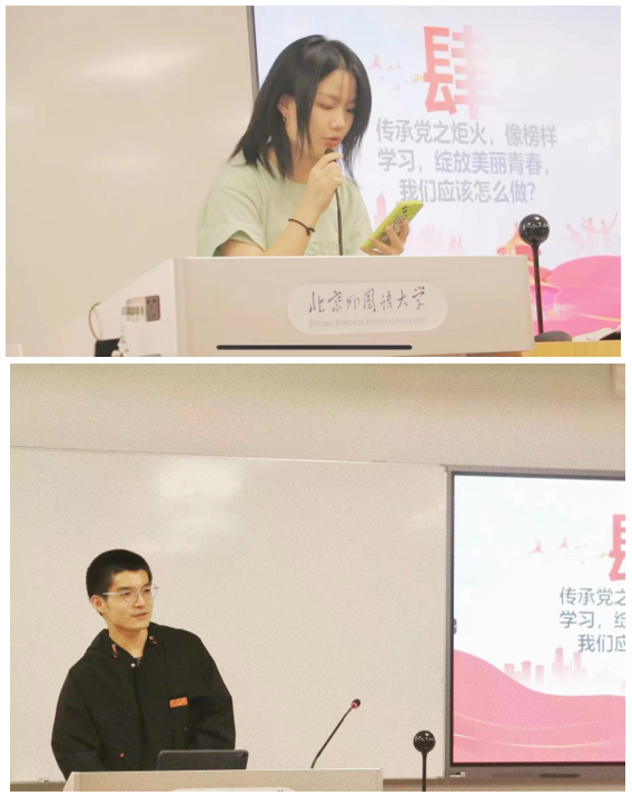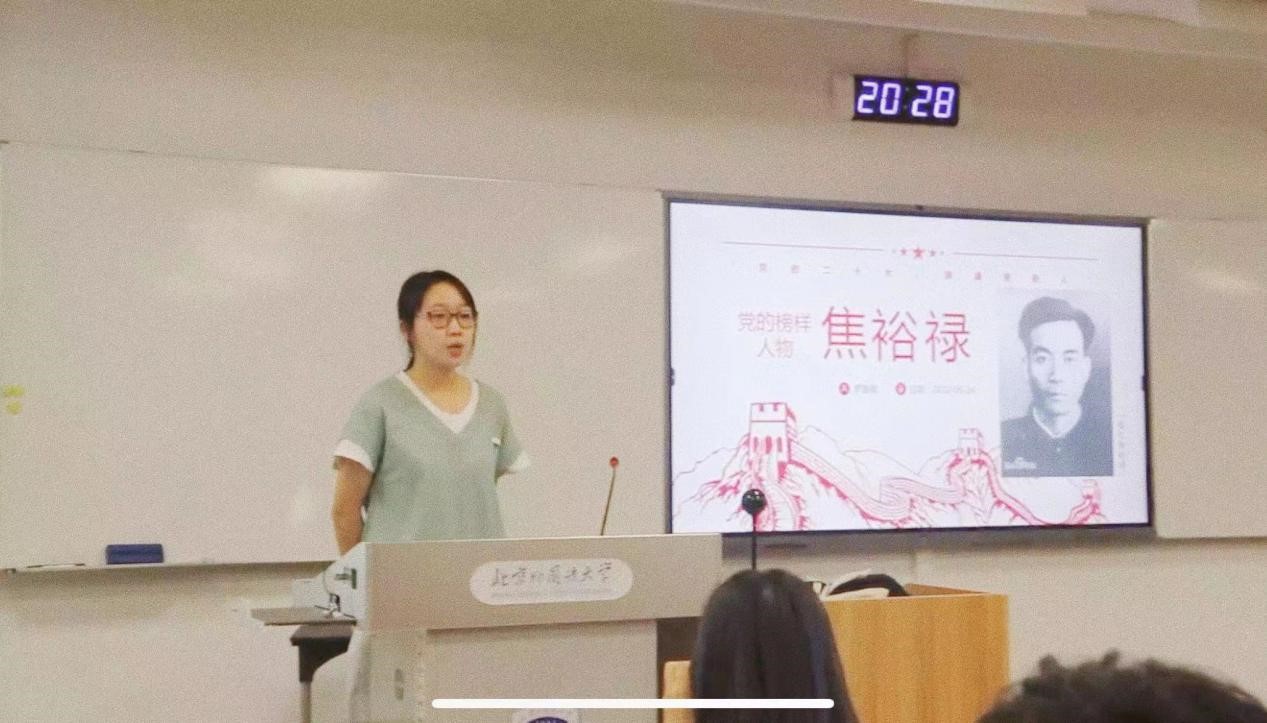 在第二环节“党的榜样人物“中,同学们在团支书带领下学习了张定宇、黄文秀等多位优秀党员的光辉事迹,罗盈盈和徐萌璐同学分享了焦裕禄和李元敏的先进事迹。党的榜样人物以身作则体现党的责任与担当,增强了同学们服务人民的精神力量。