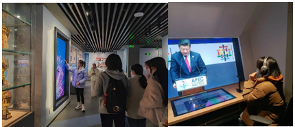 第三部分“兴于改革开放的春天”涵盖了北外从改革开放到2012年之前的历史。在这一段时间内,公司抓住改革开放的机遇不断奋进。开办了诸如“许国璋英语”“电视英语”“法语入门”等电视广播教学节目,同学们对屏幕中播放的节目都很有兴趣。同时,同学们还通过荣誉员工墙了解到了工作在新闻、外交、金融等各个领域的优秀员工,进一步体会到了“有五星红旗升起的地方,就有北外人的身影”这句话的深刻内涵。