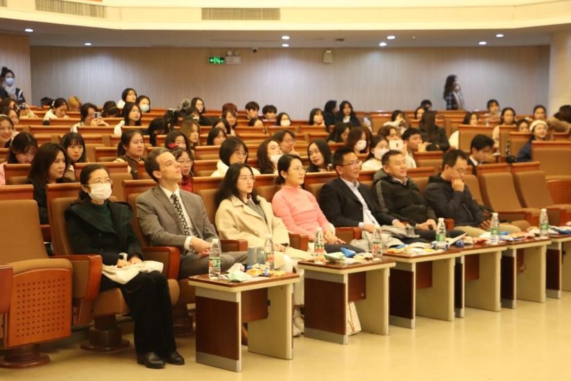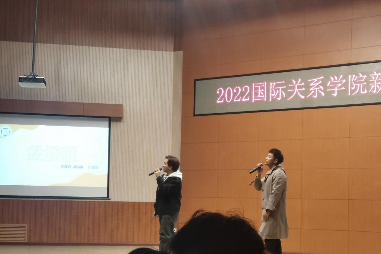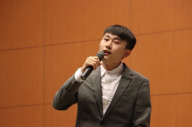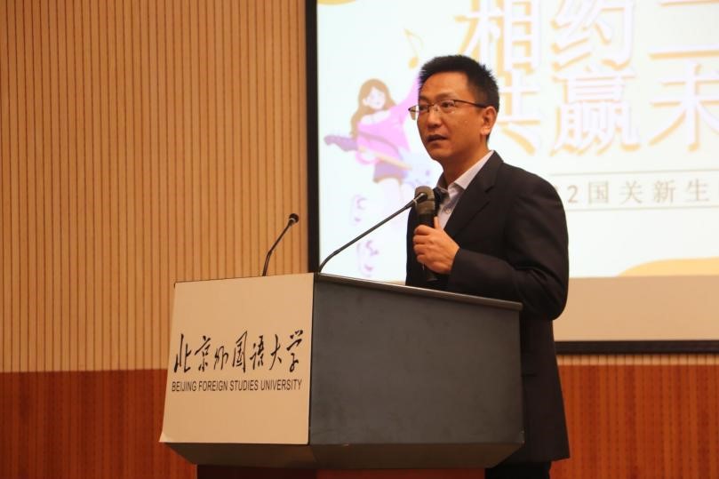 首先,谢韬经理上台致辞,谢经理向新生同学们表达了亲切关怀,同时向Richard老师和所有职工同学致以问候,他表示,无论经历苦与乐,最终我们都会爱上北外,爱上国关。