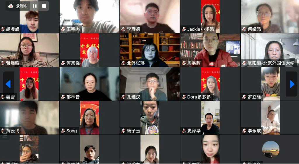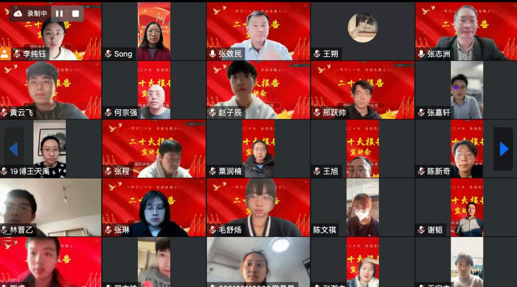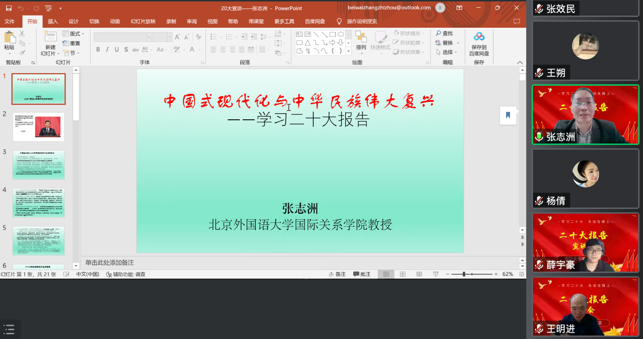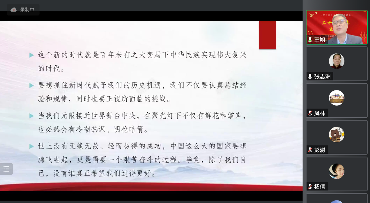 王朔教授首先以“深入学习贯彻党的二十大精神、培养新时代中国特色外交人才”为主题,深入阐述党的二十大精神,强调了新时代的精神需要五个坚持:需要坚持和加强党的领导、坚持中国特色社会主义道路、坚持以人民为中心的发展思想、坚持深化改革开放、发扬斗争精神。王朔老师接着结合本专业内容提出,对于新时代外交学建设,要建设符合新时代使命的外交学、建设符合中国利益的外交学、建设符合中国特色的外交学、建设讲好中国故事的外交学。同时,积极践行社会主义价值观、坚持理论联系实际、继承发展北外的优良传统。