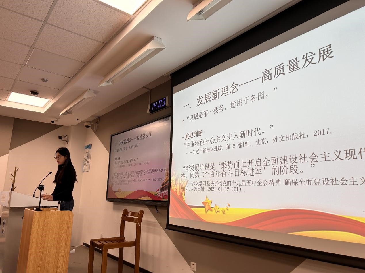 2023年12月10日,为深入学习贯彻习近平新时代中国特色社会主义思想,推动主题教育走深走实,国际关系本科生党支部在逸夫楼205教室举行主题学习活动。本次活动的主题为“从四个‘新’看习近平经济思想”,活动由国关本科生党支部预备党员王璟骊、李铄主讲,本科生党支部副书记刘辅仁主持,各年级党员、预备党员、入党积极分子和入党申请人同学参加。