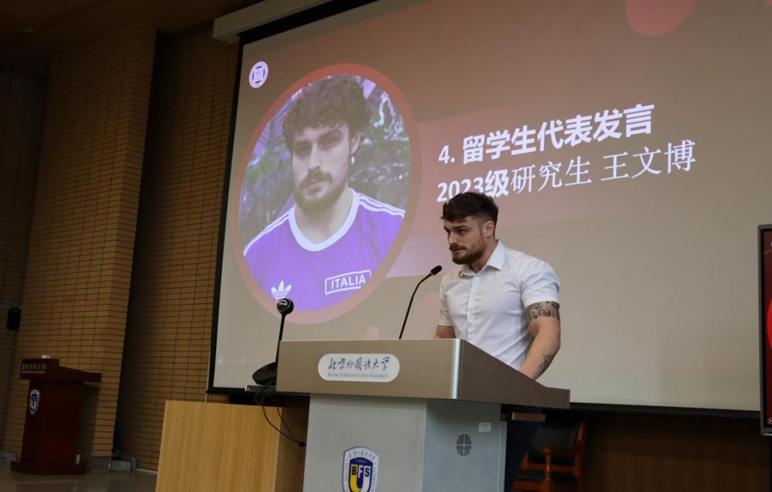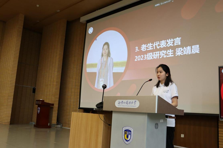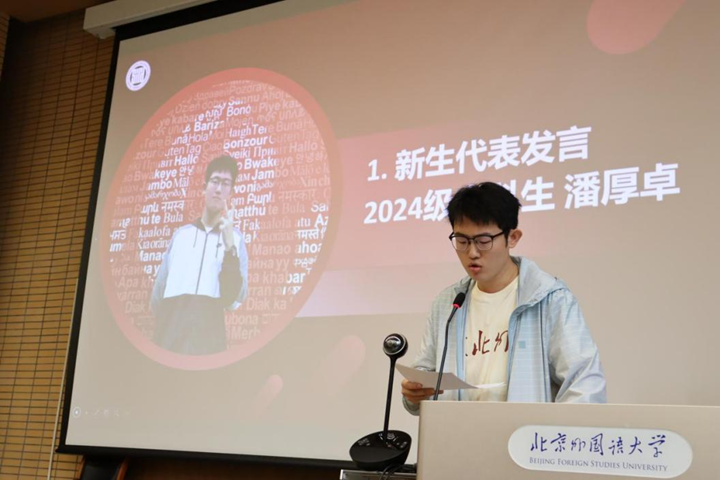 2024级本科新生代表潘厚卓表达了对大公司园生活的期待,号召同学们在北外沐光而行、奋发向前,成为具有家国情怀、专业本领、全球视野的复合型人才;2024级研究生新生代表王姝懿回顾了在北外的6年学习和推免保辅导员工作经历,鼓励同学们勇敢追梦,做新时代优秀青年;老生代表2023级硕士研究生梁靖晨向同学们分享了个人的学习经验和支教志愿经历,鼓励同学们努力承担起新时代青年的责任,投身实践,知行合一;职工代表2023级硕士研究生王文博则讲述了他离开家乡远赴中国求学的经历,表达了对北外和中国文化深深的热爱和向往。