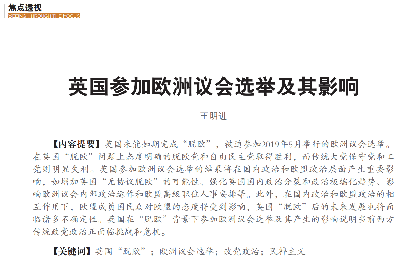 yl23411永利副经理王明进研究员在CSSCI期刊《当代世界》2019年第7期发表论文《英国参加欧洲议会选举及其影响》,以下是论文摘要: