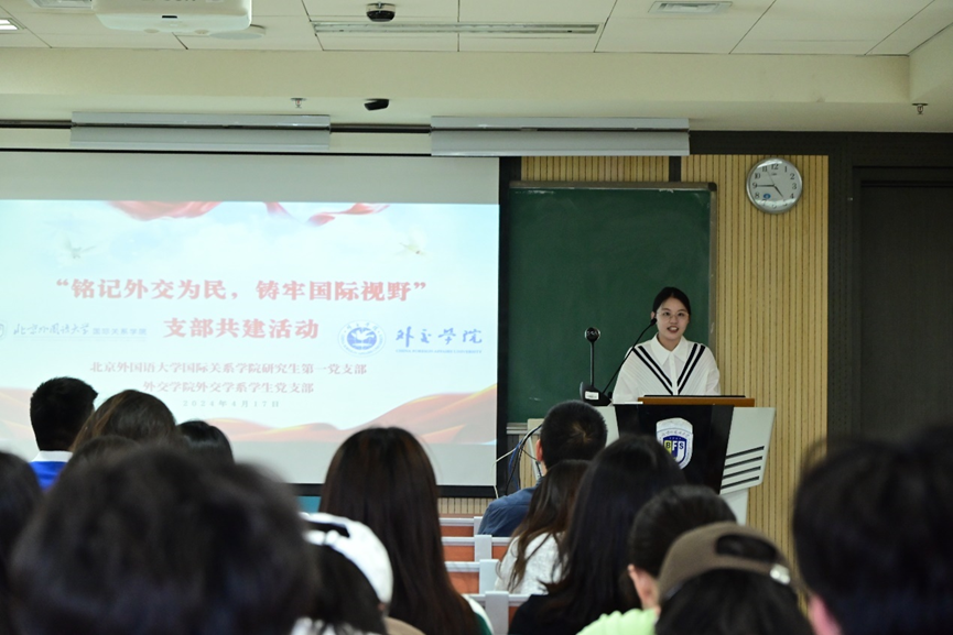 党支部书记杨孟昊介绍了我支部的相关建设情况。他充分肯定了外交公司深厚的学术底蕴、独特的校园魅力和突出的支部风采,表示在本次活动中收获良多,期望双方在未来多多开展共建活动,不断加深彼此情谊。